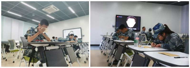 父母的祝福收到了吗?写一封家书回赠父母。在寄语中秋环节,三间教室同时播放学院提前收集的家人对孩子和广大长空学子的中秋祝福视频,教室同时备好了纸笔和信封。声声叮咛和充满希冀的眼神,表达了家人对孩子们的牵挂、祝福和对未来的期望。观看视频时,学生不由得操起一旁的纸笔,给家里人写一封简短的家书,然后放进信封里。这个环节,没有老师组织和引导,更不是必须参与,但学生纷纷被教室内的视频声音吸引,静静地坐在座位上观看。有的学生忍不住呜咽,含泪书写家书;有的同学的家书写了一页又一页,一时间教室内只能听见笔尖划过纸面的声音。