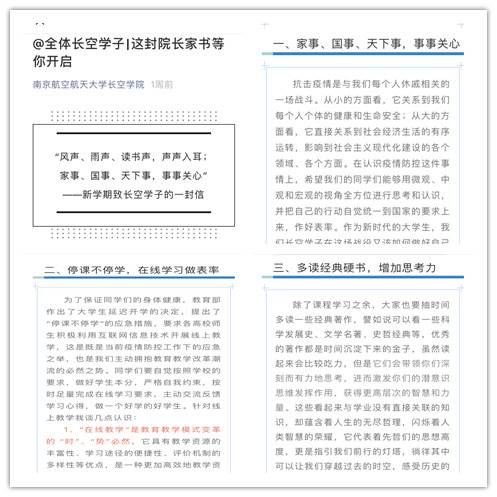 在线上教学工作开展之际,LETOU国际米兰官网常务副院长蒋彦龙为全体学生写了一封“家书”,鼓励学生“家事国事天下事,事事关心”,勉励学生“停课不停学,在线学习做表率”,激励学生“多读经典硬书,增加思考力”。从时代大势谈到自我提升,激发学生学习兴趣的同时更坚定了学生用行动打赢这场疫情阻击战的信心。