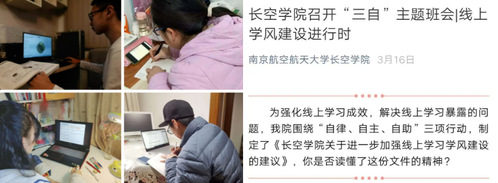 大学和高中最大的区别就是自主学习,一个只有学会和适应了自主学习的大学生才是一个合格的大学生,也只有自主学习到家的学生才有可能成为一个优秀的大学生,同学们有这样的一种意识让我们非常欣慰,为你们的这些行为点赞。另外,我们的同学们没有因为老师不在身边就放松对自己的学习要求,所有的班级都开展了“三自”主题班会,探索和加强班级同学的自律、自主、自助管理,大家也知道,我们老师不在身边,这个学风怎么管,这都是新事物,以前在学校学习的时候辅导员每天盯着你们,我们的老师也经常督促你们,但是在线学习完全要靠自律、自主和自助,通过这样一种自发有效的班级管理,我们体现出了大学班级应有的样子。