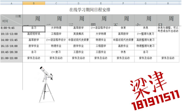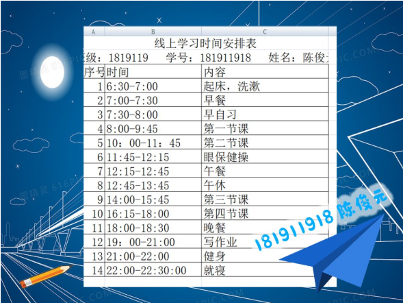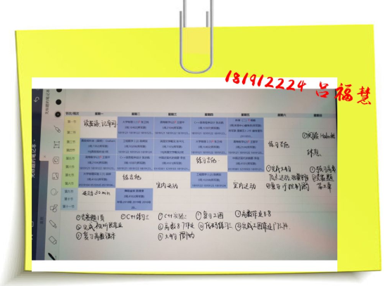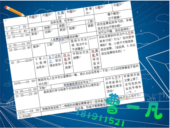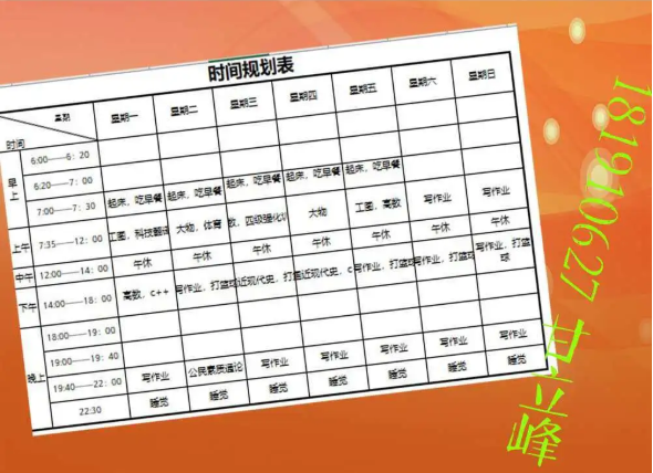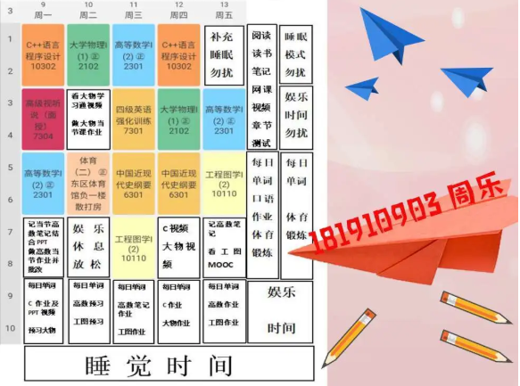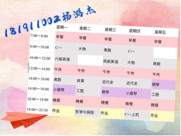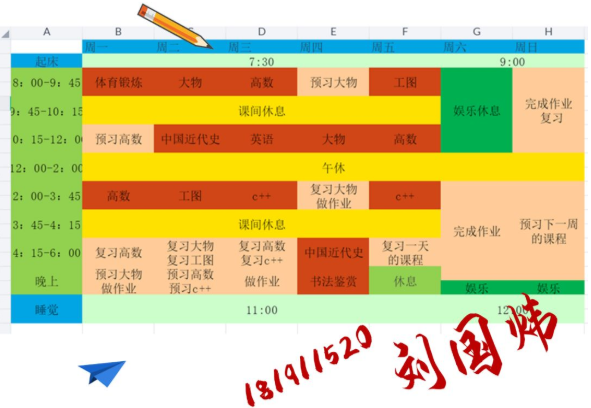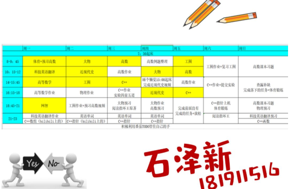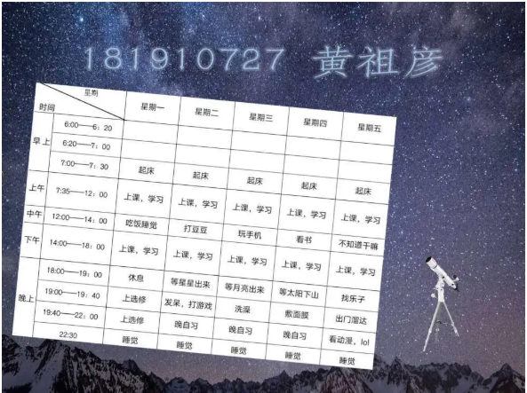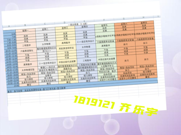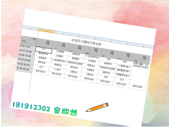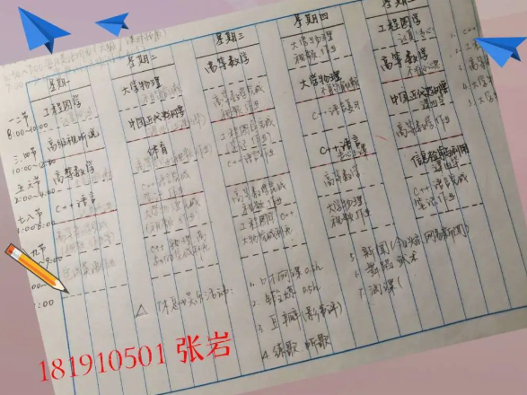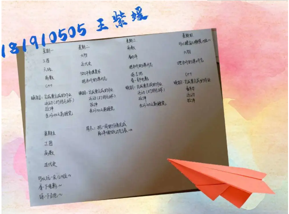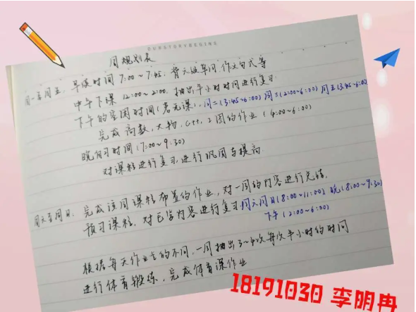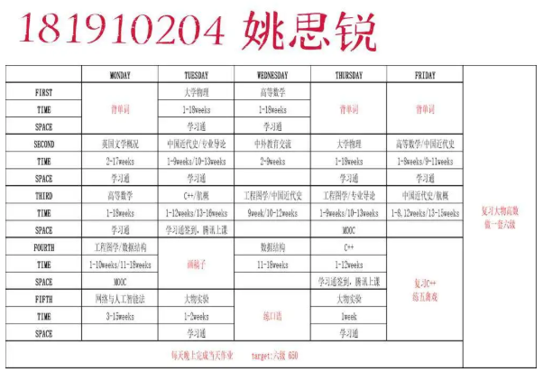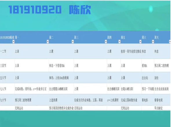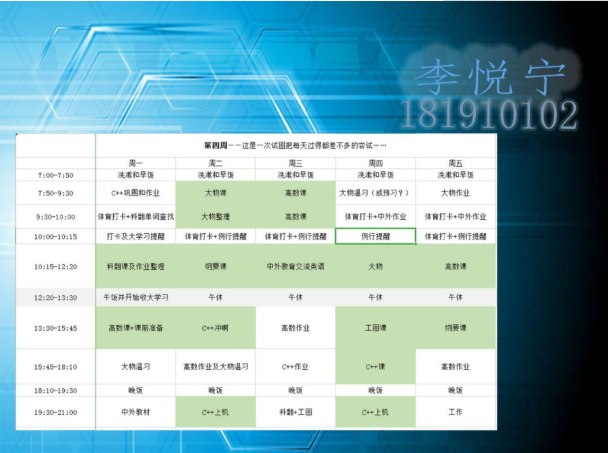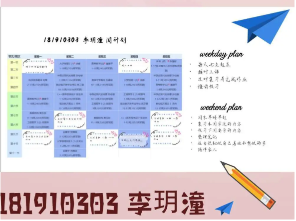 半满的课表当然要全部填满才充实,李玥潼同学的计划真是值得所有人学习。在这个竞争激烈的环境里,我们每个人都不能放松,在强大的计划之后,永远都要有强大的执行力,长空学子,又怎能没有毅力坚持呢。