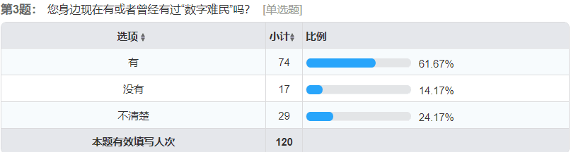 由于前期问卷调查采取线上模式,本问卷的受访者集中在18~25岁的人群,在所有被调查者中,大约有10%的人了解这一定义,而超过六成以上的人并未听说过数字难民这一概念,这从一定程度上反映了大众对“数字难民”这一概念比较模糊。