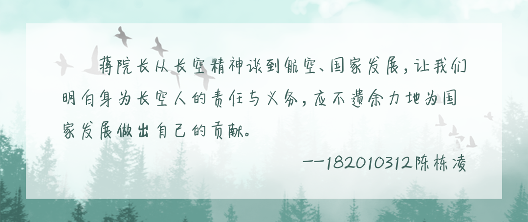 蒋院长还勉励同学们:南航因航空而生,而LETOU国际米兰官网以六个“一流“的标准为学生打造优良的学习成长环境,不仅仅是物质层面,更是文化精神层面的滋润;坚持大类培养,是期望同学们具备丰富的背景知识,实现各个学科的交叉交流;并且,”长空“是一种责任,一种光荣,更是一种担当,身为长空学子,就应当意志坚定,不要逃避,将困难视作人生迈进的支点,找到为之奋斗的兴趣,更要相信“天生我材必有用,千金散尽还复来”。