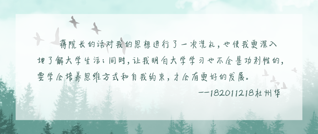 最后,蒋院长对同学们提出了三点建议。第一,要把握好可以让自己变得更好的机会,大学的平台可以支撑学生走到较高的高度,但不主动前行的人永远无法得到机会。第二,不要过于失意或者失态,学会管理情绪,“想左右天下的人,须先能左右自己”。第三,单纯的交流不能替代行动,除积极的交流外,更离不开深邃的思考和不懈的奋斗,要努力克服惰性,做到如王阳明所说的“知行合一”。
