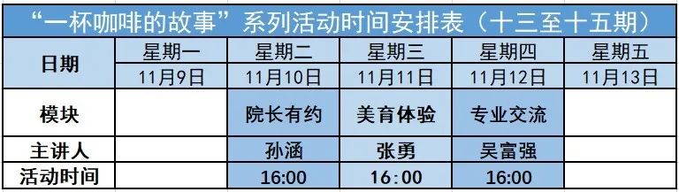 这周一杯咖啡的故事可是干货满满,而下一周的一杯咖啡会更加精彩。经验丰富的院长、教授和体育中心的老师会在专业和健康方面给大家很多帮助,解决大家的困惑!
