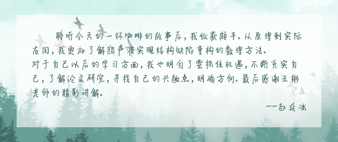 11月6日,航空学院的王彬老师来到“一杯咖啡的故事”,与同学们进行了轻松愉快的专业交流。王老师向大家介绍了他的研究方向与研究进程,用专业化的术语,从三个层面向同学们介绍了超声导波的相关知识。王彬老师随和亲切,语言生动幽默,让同学们如沐春风,收获颇丰。
