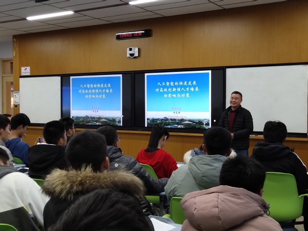 何炎祥教授首先系统梳理了人工智能发展的历程,全面分析了人工智能对人类社会发展的影响与挑战,着重阐述了人工智能的快速发展对高校创新性人才培养的影响。他指出人工智能与其他学科的交叉是时代发展的趋势,AI复合班的设立是学科交叉融合的生动实践,作为AI复合班的学生要充分利用学校和学院创设的平台和资源,以获得职业胜任力为目标有使命的学习,注重培养自己面向未来解决复杂问题的能力。