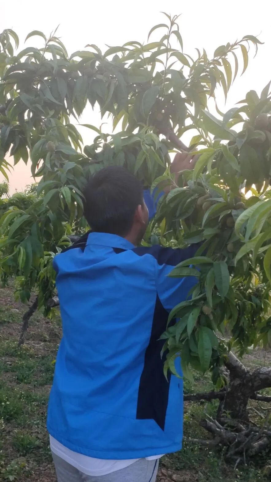 照片记录的是我去桃园里“疏桃”,顾名思义,就是在桃树刚长出桃子时先摘下一些,否则收获的桃子数量虽多,品质却不尽人意。我家的桃林非常招人喜爱,春天片片粉红令人流连忘返。风起兮:“满园桃李闹春风,漫红红白白。争似淡妆娇面,伴蓬莱仙客。”拂过脸庞,无声无语,一俯一仰,芬芳无数。待桃熟之际,那种香甜,是从小到大记忆里的味道,咬一口就能回到儿时天真烂漫的时光。