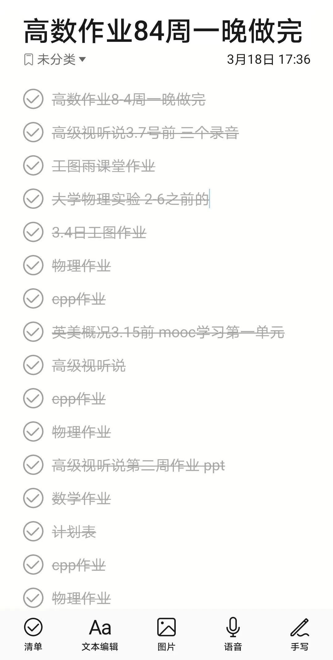 课后,为了防止忘记课后学习任务,我把每天的任务记录在手机的备忘录里每完成一个任务,便把它划去。我选择在上午和下午下课时整理任务,标注时,我会标注任务内容和截止时间。因为有时我会忘记查看备忘录,忘记上交作业,所以我特意把备忘录里的时间设置得比截止日期早一天到两天,防止超时 。