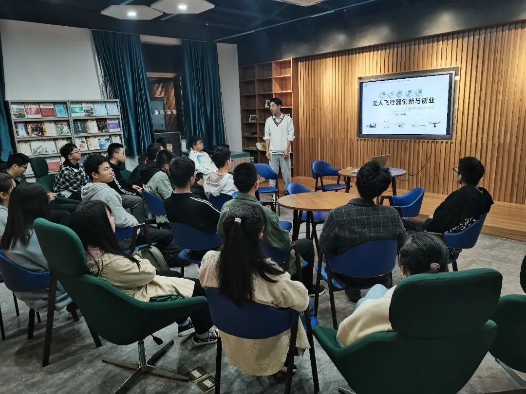 活动伊始,郑磊磊向在场同学提出了几个有关无人机型号的问题,在他幽默风趣的提问中,现场气氛很快活跃起来。紧接着,他分别从其他飞行器无人机两个角度介绍了无人机的发展历史。在谈到两者的差别时,郑磊磊说到:“二者的飞行方式不同。通俗来说,无人机可以实现自主飞行,而其他飞行器不可以,必须由人通过遥控器控制,也就是无人机的“大脑”始终是在地面,在操纵人员的手上。其二是用途不同,其他飞行器更偏向于军事用途或民用特种用途,而无人机更接近于航空模型,相关企业主要从事航测无人机设备的设计、生产、销售、及航测航拍服务,特点是费用低、技术强、工期短、精度高。