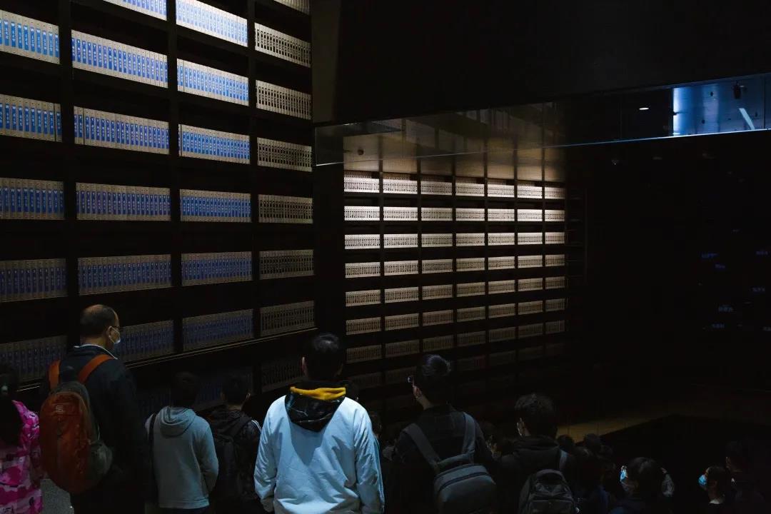 在史料陈列馆中,同学们重温了1937年12月至1938年1月的南京大屠杀史实。一进入展馆,扑面而来的是黑暗、压抑,就像那段历史,惨痛而沉默。在数米之高的墙面上,摆放着一本本书籍,印制着无数姓名,红色的是不幸遇难者,蓝色的是幸存者,灰色的是第三方证人,书籍无声,它依旧沉默。