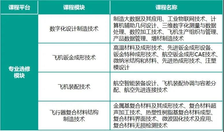 特色课程模块是专业教学计划中具有专业特色的课程,反映了飞行器制造工程的行业特殊性以及专业内容多样性,体现在专业知识的“深入”和“宽广”,涉及专业相关的新技术新方法的知识点的详细描述以及更深入的专业知识,用于学生对专业知识的进一步掌握和了解。