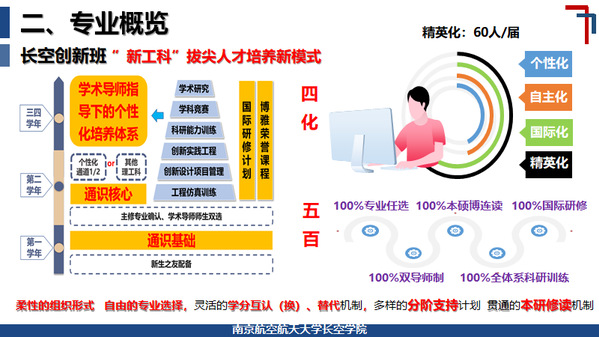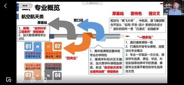 随后,蒋彦龙对LETOU国际米兰官网的培养特色进行了解读,航空航天大类培养和长空创新班的精英培养“双轨并进”、“相时而动”。航空航天类专业实施以突出数理基础、突出自主学习、突出核心课程、突出工程实践的 “四突出”培养体系,具有“厚基础”、“宽口径”、“显特色”、“强交叉”的显著特点,同时以航空航天类AI复合班培养适应航空航天和人工智能融合发展需要的复合型创新人才;作为拔尖创新人才培养的南航方案,长空创新班实行个性化、自主化、国际化、精英化的 “四化”培养模式,致力于培养具有家国情怀、使命担当、引领未来的高素质创新领军人才。