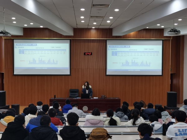 会议首先结合期中考试成绩对年级学风建设情况进行分析总结,指出日常学习中早自习状态不佳、课后学习时间少和期中考试中存在成绩两极分化严重、学院横向对比不突出等问题。其次,辅导员着重强调了加强学风建设和班团建设的重要性,提醒学生利用好早晚自习的时间,提高学习效率,备战期末。