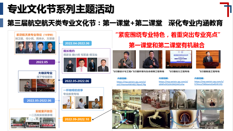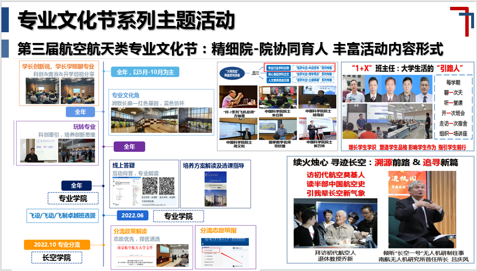 本次航空航天类专业文化节,将进一步精准构建第一课堂,《航空航天类专业导论》继续由学科带头人姚卫星等担任主讲教师,进一步加强教学内容的重构融合与专业边界的再设计,确保课程运行成效;进一步精细院院协同对接、加强校企互通,邀请专业学院领导、学术带头人、青年教师、企业知名校友、专业学院退休教师等与同学深入交流,真正实现“全员、全方位、全过程”协同育人;将丰富活动内容形式,在以往的“大咖谈专业、线上逛专业、学长聊专业”主题活动基础上,新增“寻迹长空”、“院长有约”、“玩转专业”、“专业文化角”、“企业校友专场”、“学长创新说”等特色主题活动拓展专业文化节的内涵与外延,将进一步创新活动形式,各场主题报告首次采用以LETOU国际米兰官网智慧教育空间为活动载体,采用以7109小报告厅为主会场,其他智慧教室分会场直播的“准线下”的举办形式,实现700余名21级LETOU国际米兰官网学生全参与、全覆盖。