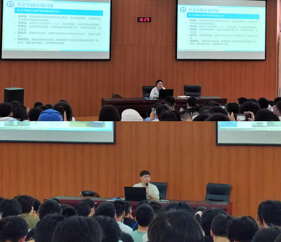 随后,辅导员马晓萌就社会实践中常见问题举例并答疑,同时带领学生解读了相关文件,对实践主题专项进行了专业性说明。辅导员范雷明以自身经验阐述了社会实践与科技竞赛之间的关系,着重强调社会实践可以锻炼同学的科研技能,鼓励同学们将专业知识应用于社会实践。