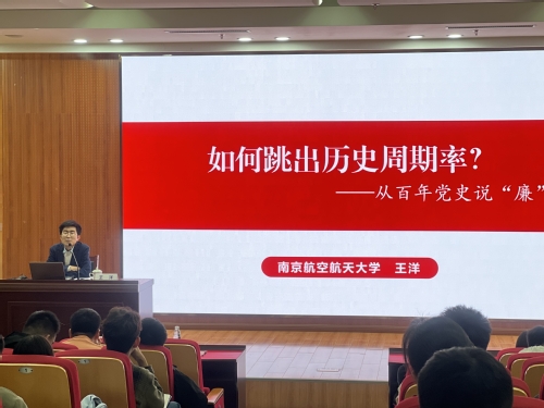 第二场专题讲座由校团委副书记王洋主讲《如何跳出历史周期率——从百年党史说“廉”》。王洋从党的百年发展历程中系统梳理了党的纪律建设发展主要阶段以及重要意义。他强调,党的纪律建设是百年党史一以贯之的党建主题,勉励同学们真正做到学纪、知纪、明纪、守纪,作为长空学子更要传承红色基因,放飞蓝色梦想,坚定远大志向,传承优良传统,担当时代使命。