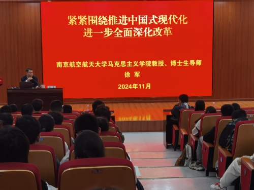 首场专题讲座由马克思主义学院副院长徐军教授主讲《紧紧围绕推进中国式现代化,进一步全面深化改革》。徐军从改革开放以来党的历届三中全会着手,深刻剖析了全面深化改革的历史方位、战略布局,对党的二十届三中全会精神进行了全面系统的梳理和解读,让同学们深刻认识到全面深化改革与每个人息息相关,引导同学们在全面深化改革的火热实践中书写青春篇章。