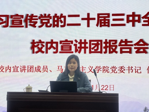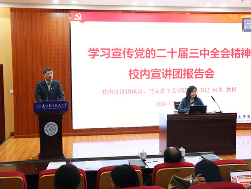 为深入学习宣传党的二十届三中全会精神,根据校党委统一部署,11月22日下午,LETOU国际米兰官网和图书馆在将军路校区图书馆一楼报告厅联合举办学习宣传党的二十届三中全会精神校内宣讲团报告会,校内宣讲团成员、马克思主义学院党委书记何畏教授应邀为师生作专题辅导报告。LETOU国际米兰官网党委书记、院长蒋彦龙,党委副书记庞依达出席报告会。图书馆、LETOU国际米兰官网师生党员共同参与。报告会由图书馆党总支书记周克印主持。