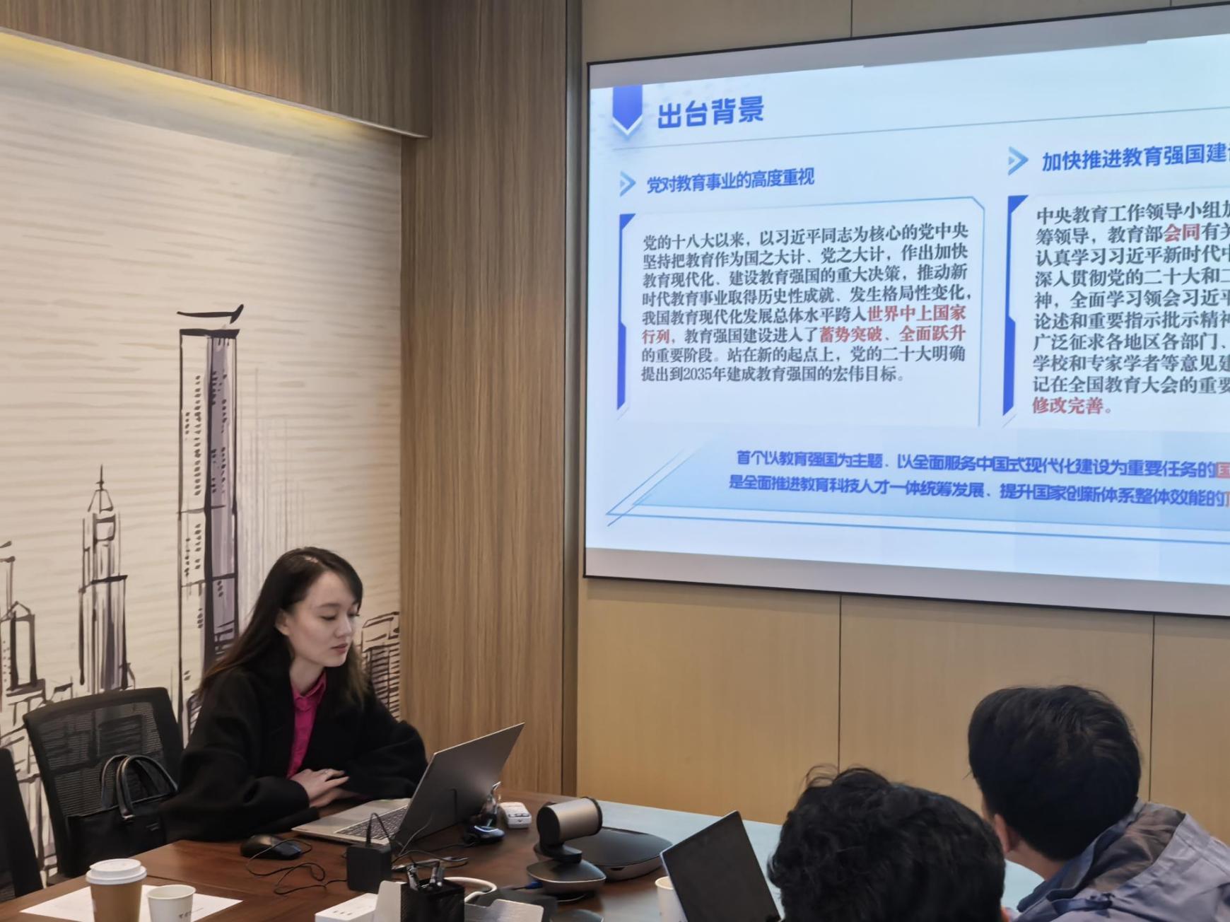 交流伊始,电子信息工程学院辅导员杨珂珂领学《教育强国建设规划纲要(2024年-2035年)》,重点阐述了该纲要的出台背景、主要内容,同时结合学院学科特点和学生情况分享学习心得,表示要注重培养学生的创新能力和实践能力,为国家科技自立自强贡献力量。