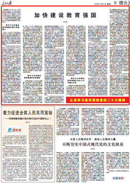 教育是国之大计、党之大计。习近平总书记所作的党的二十大报告首次将“实施科教兴国战略,强化现代化建设人才支撑”作为一个单独部分,充分体现了教育的基础性、战略性地位和作用,并对“加快建设教育强国、科技强国、人才强国”作出全面而系统的部署,为到2035年建成教育强国指明了新的前进方向。