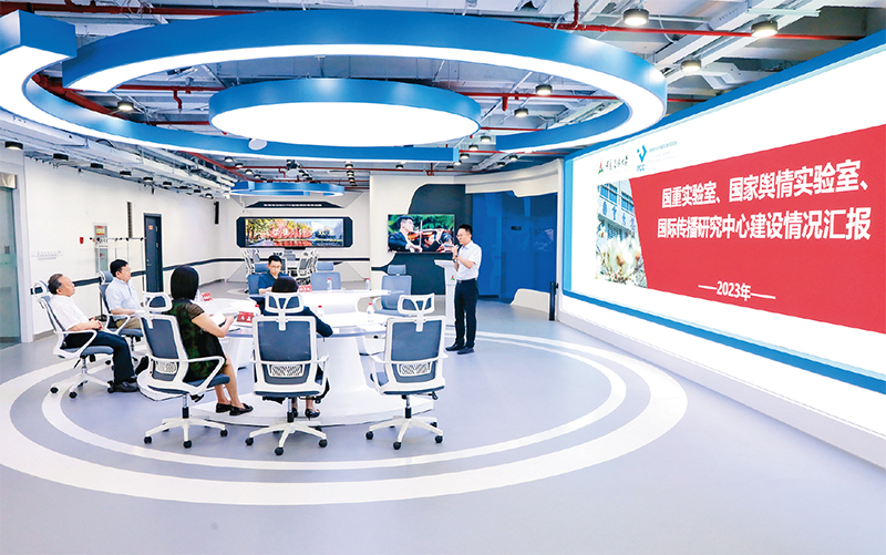 教育部党组巡视聚焦高等教育“四个服务”时代使命,把服务国家重大战略作为巡视监督重点内容。图为2023年6月1日,教育部党组第一巡视组在中国传媒大学调研教育部首批试点建设的9家哲学社会科学重点实验室之一——国家舆情实验室。(教育部供图)